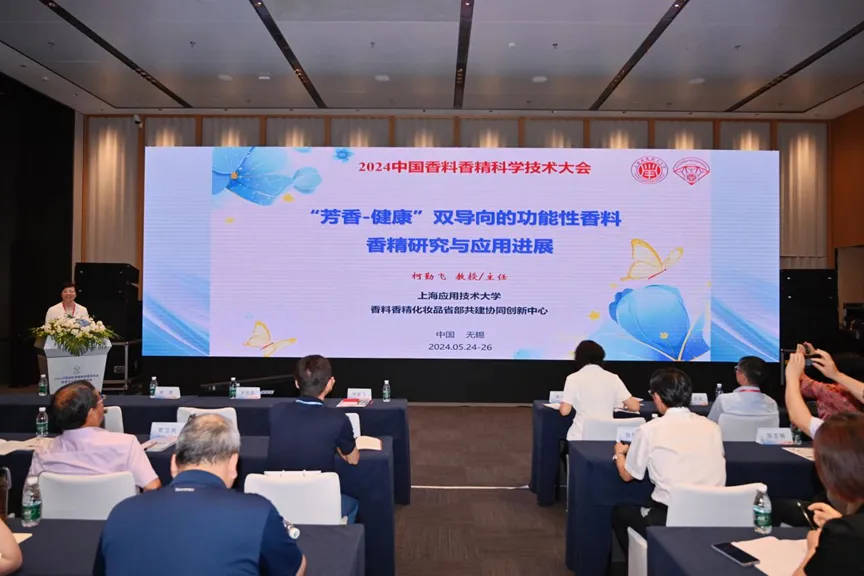 2024年5月25日,以“智慧科技 无限可能”为主题的2024中国香料香精科技大会暨第十五届学术研讨会在无锡国际会议中心隆重召开。香料香精化妆品省部共建协同创新中心主任柯勤飞教授应邀率队出席大会,并发表了题为《“芳香-健康”双导向的功能性香料香精研究与应用进展》的主题报告。