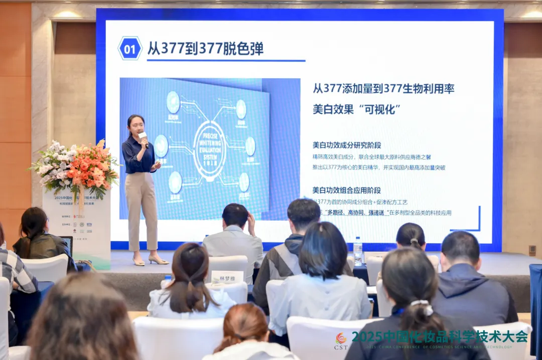 肌肤未来首席配方师林梦雅博士受邀在化妆品行业前沿科学技术交流环节作主题演讲,以《走近精准美白:肌肤未来始于377、超越377的技术创新之路》为题分享了肌肤未来SKYNFUTURE多年来以创新突破为指引在科学美白之路上走过的进化历程。