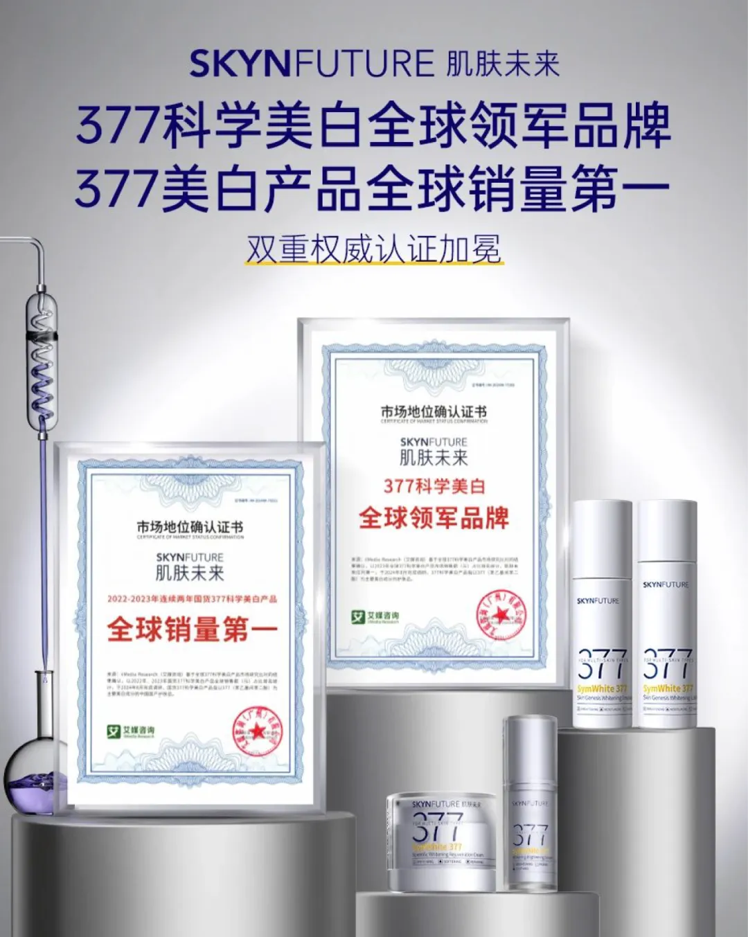 从首款爆品377美白精华液到一代377面霜,再到全新升级的二代377系列,肌肤未来SKYNFUTURE正不断拓宽377科学美白产品矩阵。截至目前,肌肤未来拥有以377为主打成分的美白特证产品数量创国内行业先锋。 市场是检验实力的唯一标准——据艾媒咨询数据显示,以2022-2023年全球377科学美白产品市场销售额(元)占比排名统计,肌肤未来SKYNFUTURE在国货377科学美白产品中达到全球销量第一,荣膺“377科学美白全球领军品牌”;2022-2024更是连续三年保持“国货377科学美白产品全国销量第一”,以中国品牌定义世界成分。