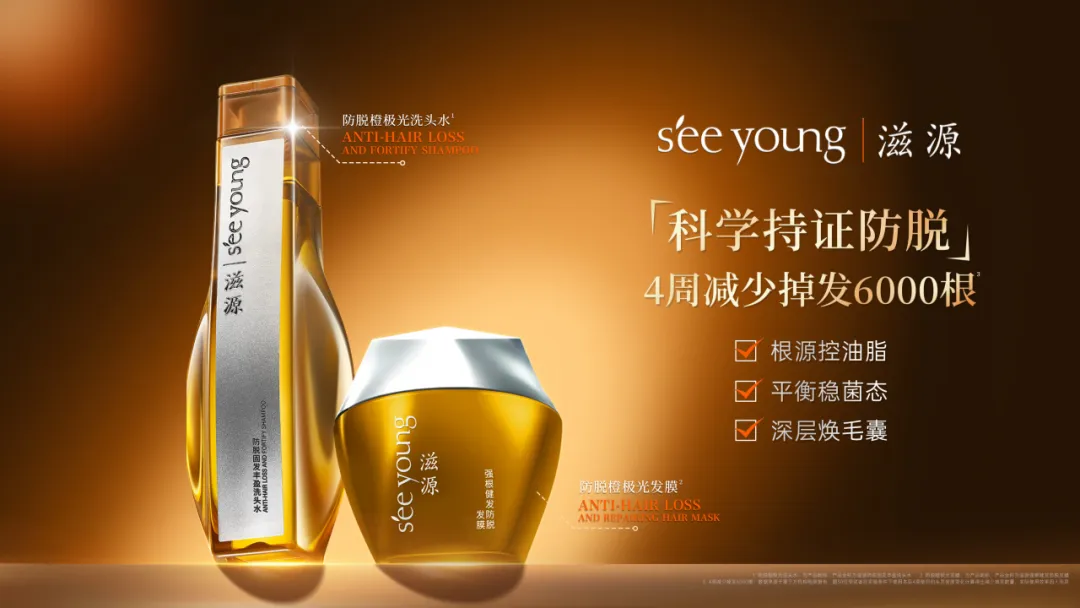 以益丝元为主要防脱成分,滋源SEEYOUNG在2025年3月推出微生态头皮护理系列防脱新品“滋源防脱橙极光”【5】,加持三大独家专利技术【6】,通过毛囊细胞促活科技实现全链路防脱,实现4周减少掉发6000根【7】,获得了2个新防脱特证【8】,取得了5份第三方权威功效认证报告【9】,至此正式开启防脱新篇章。