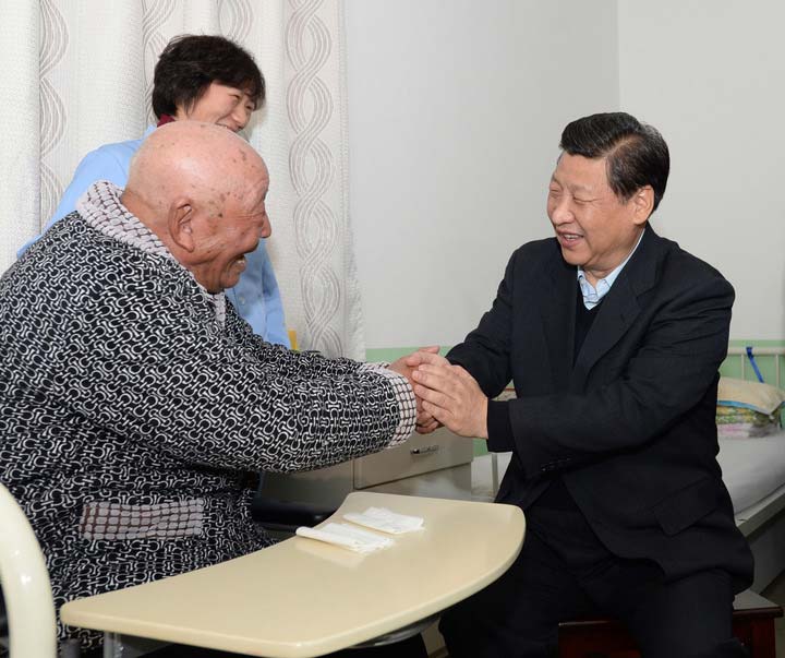 2013年12月28日,习近平总书记在北京市海淀区四季青敬老院看望五保老人时同他握手交谈。